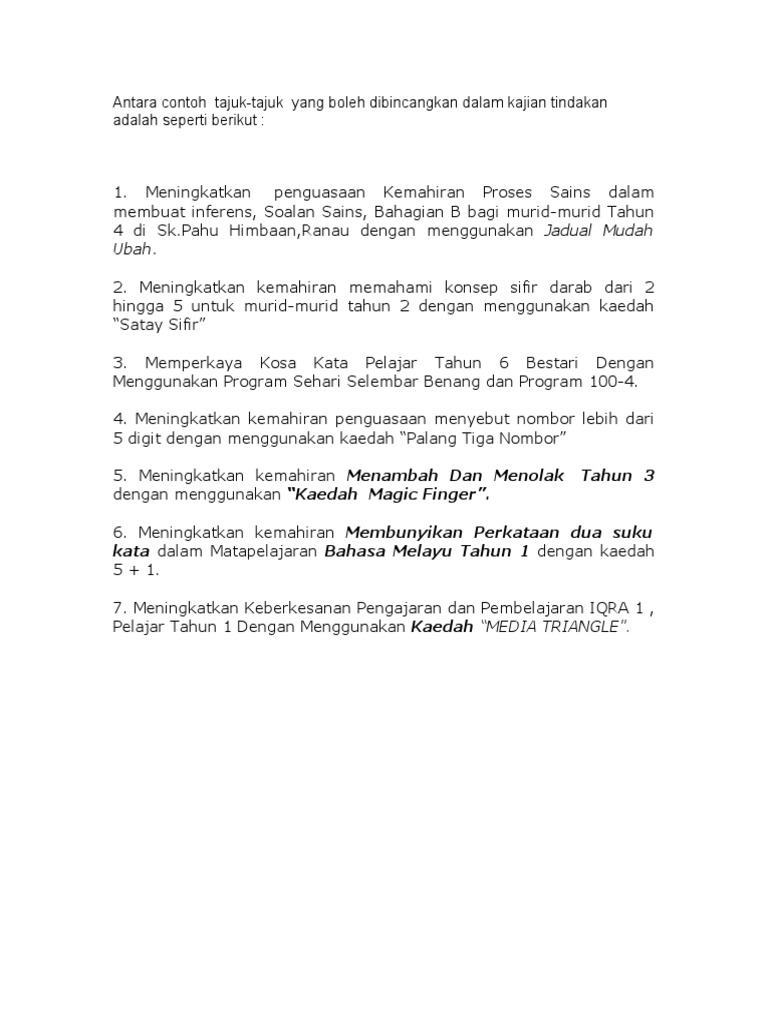 Cadangan Kajian Tindakan Prasekolah 2014 Program Membaca Yang berikut merupakan contoh Kajian Tindakan yang paling ringkas yang saya tulis untuk membantu murid membaca. Format dan Penerangan Penulisan Kajian Tindakan untuk. Bahagian Perancangan Penyelidikan Dasar Pendidikan.